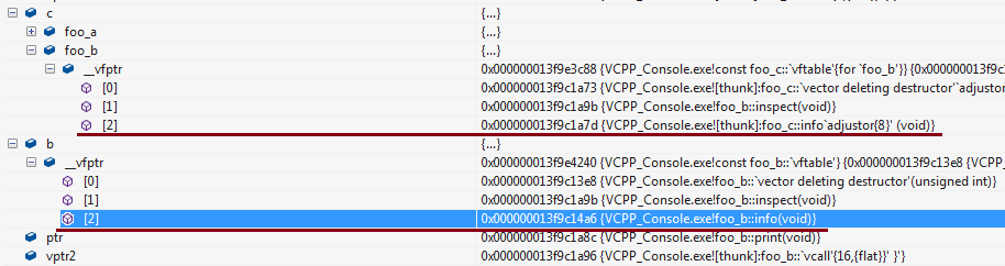 但是c的虚表内记得地址不是直接记得foo_c::info的地址,因为要把this指针由foo_b转回foo_c。