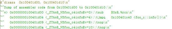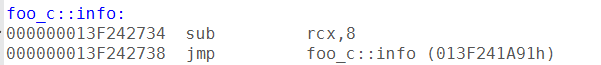 可以看到c和b的foo_b类型的虚表的info函数指向的地址是不同的。b中的foo_b虚表中的info函数直接指向了foo_b::info,但是c中的foo_b虚表里的info函数指向的地址先做了类型转换的地址调整,再才跳到foo_c::info,所以c的info的vcall跳过去后的代码是这样: