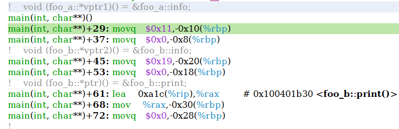 如上图所示,比单继承多了两行,第一行是调整虚表地址到foo_b,这点和VC一样。后面增加的add指令是调整成员函数的this指针地址。