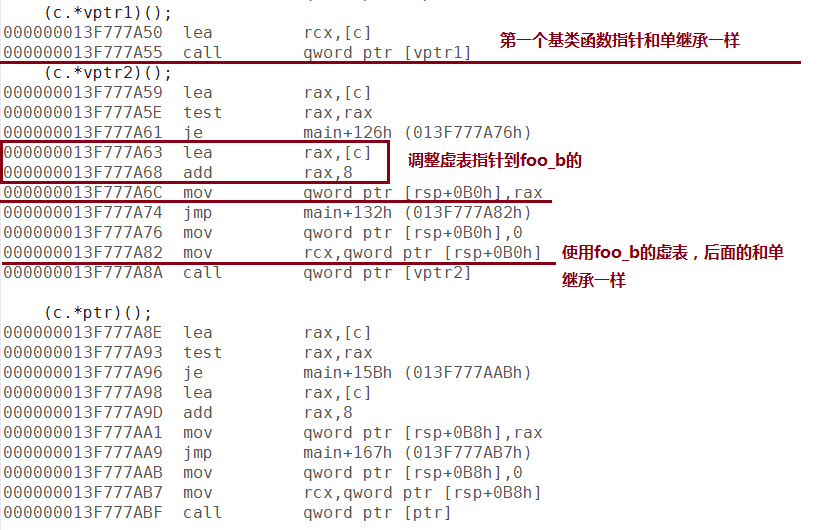 调用的时候主要看(c.vptr2)()的代码。因为*(c.vptr1)()生成的和单继承一样**。而由于它们最终都转向vcall,所以vptr2的时候调整了虚表指针为c的第二个虚表。顺便把this指针地址调整了。